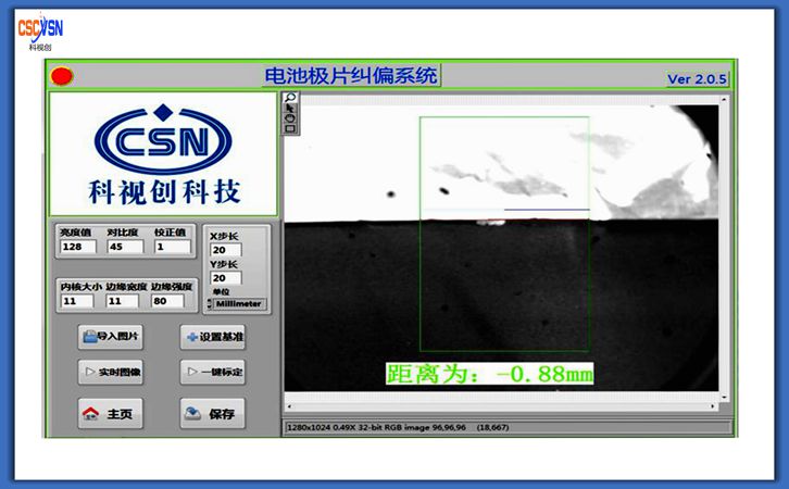 電池糾偏系統(tǒng)是以鋰電池極片卷料裁切機(jī)上使用的裁切位置糾正,機(jī)構(gòu)電氣調(diào)整好基準(zhǔn)位置后在視覺軟件系統(tǒng)上做出基準(zhǔn)位置。以后的極片過來測(cè)量現(xiàn)在的位置與標(biāo)準(zhǔn)位置做對(duì)比,得出偏移數(shù)據(jù),然后通過串口協(xié)議將偏移量發(fā)送給PLC,PLC實(shí)時(shí)調(diào)整切刀位置。